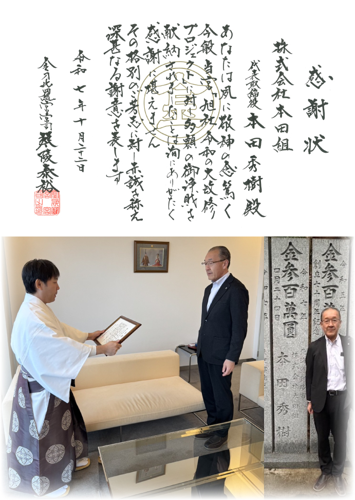 また、ありがたいことに宮司様より感謝状をいただくこともできました。
