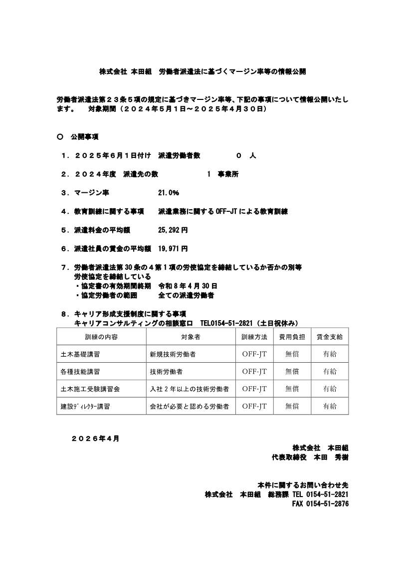 新着情報 お知らせ 2026/04/15 労働者派遣法に基づくマージン率等について お知らせ 2024/09/15 令和5年度施工実績 お知らせ 2023/11/15 労働者派遣法に基づくマージン率等について お知らせ 2023/11/01 令和4年度施工実績 お知らせ 2022/06/01 令和3年度施工実績 カテゴリー別 お知らせ 会社行事 アーカイブ 2026年4月 2024年9月 2023年11月 2022年6月 2022年3月 2021年7月 2020年5月 2020年3月 2019年4月 2018年7月 2018年5月 2018年4月 2017年10月 2017年8月 2017年6月 労働者派遣法に基づくマージン率等について お知らせ 2026年04月15日 令和6年度の労働者派遣法に基づくマージン率等についての情報公開